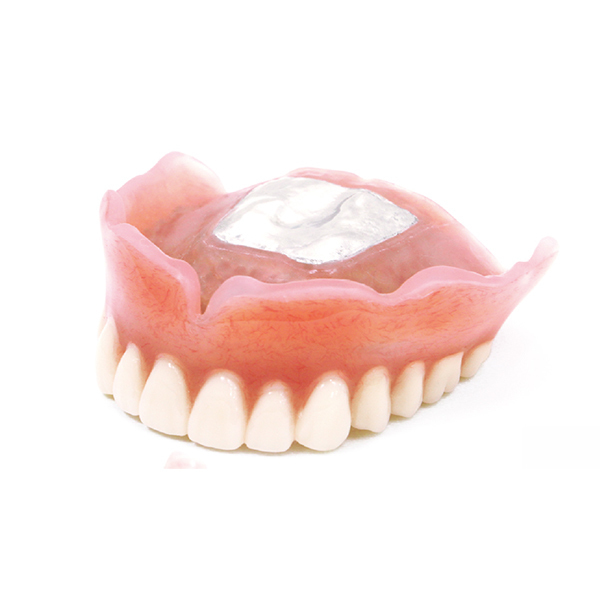 使用中の入れ歯をスキャンし、3Dプリント技術で作製するやわらかい総義歯です。裏側は生体用シリコンというクッション素材で覆われています。噛んだ時の痛みが少ない、外れにくいという特徴があります。